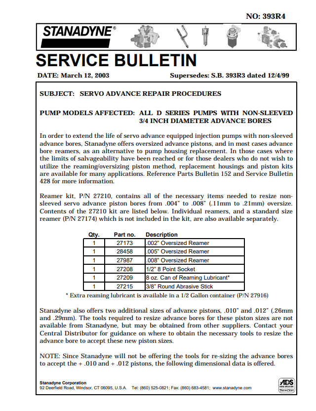 Stanadyne Advance Bore Reamer Part# 27987 size .008 for Advance repair Procedure